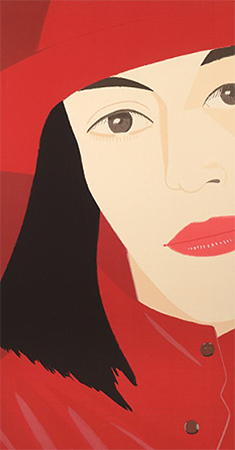 カッツが本格的に美術の世界に入った当時は批評家・ブルームバーグが提唱した抽象表現主義が脚光を浴びていた頃でした。マーク・ロスコやジャクソン・ポロックなどの抽象作品に多少は影響されたそうでしたが、独特の表現様式を確立する道を選びました。特大なキャンバスに自分の家族や友人たちの肖像を描きはじめ、それらの作品は写実的ですが、リアリズムと異なる独自の表現様式を模索しました。線と面で構成された一見単純にみえる肖像画は明快であるがゆえに強いメッセージ性が含まれています。人間の感情が最も強く表れる表情をシンプルに構築することにより鑑賞者に考える余地と複雑に考えすぎてはいけないという意図を感じ取れます。