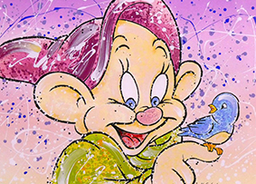 デビッド・ウィラードソンは「ペップアート」とも言われ、明るい彩りのデザインがキャラクターの表情を豊かにし、見ている人に勇気と希望を与えているでしょう。初期の作品は筆のみを使っていましたが、病気療養後はエアブラシも追加するようになり、さらにディズニーの雰囲気が演出されています。版画で描かれるキャラクターには勢いがあり、絵の具が飛び散るような背景と組み合わせることで、作品の中で生きるミッキーマウスやミニーマウスに生命力が吹き込まれているかもしれません。