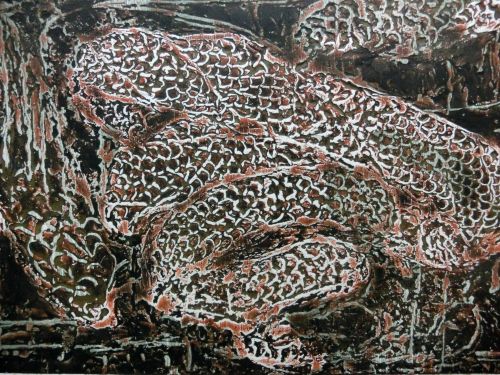 パネルなどに描かれている作品です。抽象的であり具象的な印象を感じさせる作風となります。大胆な色使いと神秘的なモチーフが特徴です。