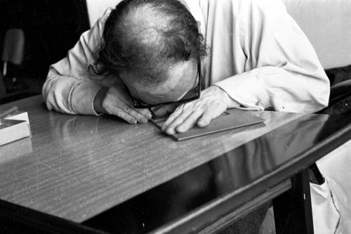 分厚い眼鏡をかけ、板に顔を近づけながら全身を使って彫り進める制作姿勢は、棟方志功の代名詞ともいえます。