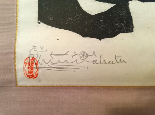 注意点: サインがあるからといって100%本物とは限りません。後年、版木から遺族などが摺り出したもの(後摺り)にはサインがない場合が多く、評価額は本人の直筆サイン入りに比べて下がることが殆どです。