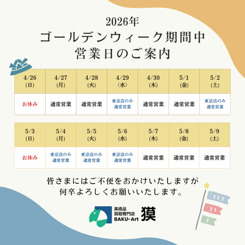美術品買取専門店 獏 大阪店および名古屋店では、下記の期間を休業とさせていただきます。