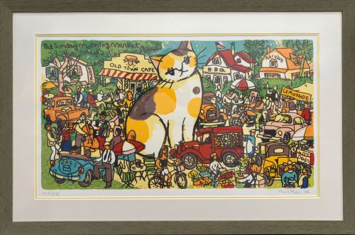 日曜日の朝の賑やかな光景と現実世界では考えられない猫のサイズが印象的です。作品のサイズも大きく、絵画相場を考慮して精一杯評価させていただきました。