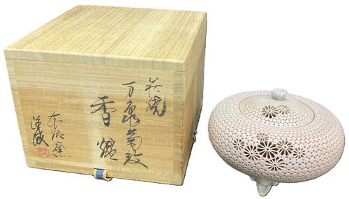 廣澤洋海「萩焼万亀菊紋香炉」をお買取りいたしました。