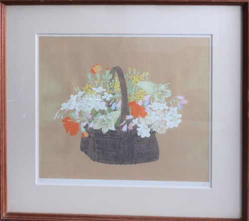堀文子のシルクスクリーン作品です。堀文子らしい繊細な花と篭の描写が魅力的です。直近の相場観と図柄、ダメージなどを考慮して評価させていただきました。