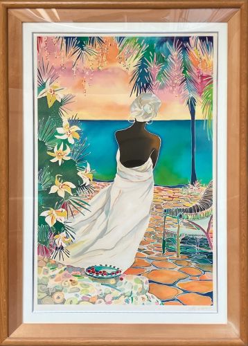 南国特有のハツラツとした色味が特徴的です。原色を羅列するのではなく女性作家特有の優しさも感じさせてくれます。また、立派なサイズで迫力があります。直近の挿画を考慮して買取させていただきました。