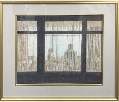 この作品はまるで外から室内を覗き見るような視点で描かれており、観る者をカーテン越しに広がる世界へと誘います。 少々絵の具のワレがありましたが、10号という飾りやすいサイズであることや直近の相場を踏まえて頑張って評価させていただきました。