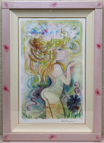 水森亜土氏の版画作品を買取させていただきました。額縁もピンク色で全体的にキュートな印象です。作品のサイズ感も良く、直近の絵画データを加味して評価させていただきました。