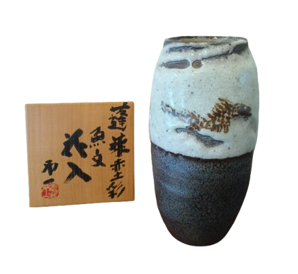 清水卯一「蓬莱赤土彩魚文花入」をお買取りいたしました。