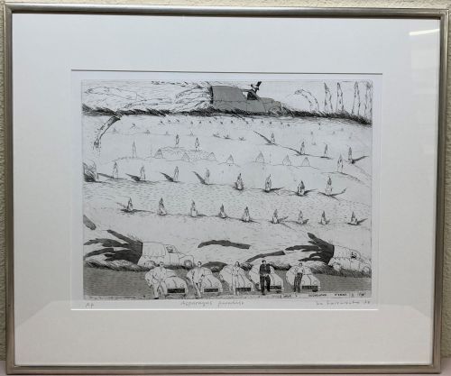 こちらは1977年に制作された銅版作品です。やや波打ちやヤケが見られましたが、サイズも大きく、可愛らしい図柄のため精一杯の評価をさせていただきました。